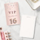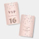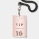 A modern, stylish and glamourous badge for a girl's Sweet 16th birthday party. A faux rose gold and pink metallic looking background with pink faux diamonds. The name is written with a modern dark rose gold coloured hand lettered style script. With the text: VIP Number 16 is written with a balloon style font, script.