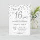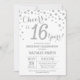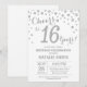 16th Birthday Invitation with Silver Glitter Diamond Background. Silver Confetti. Kids Birthday. Boy or Girl Teen Lady Teenage Birthday. For further customisation, please click the "Customise it" button and use our design tool to modify this template.