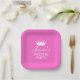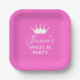 16Th Birthday sweet sixteen party hot pink custom Paper Plates personalised with name. Stylish design for sixteenth Birthday of teen girl. Elegant script text and princess crown. 16th Birthday celebration design. Pink and white. Available in different sizes. Square and round options.
