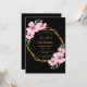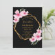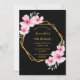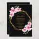 A tropical floral 16th birthday party invitation with pink hibiscus flowers, greenery and a faux gold geometric frame. Elegant black background. Templates for a name written with a modern handlettered style script, templates for your party information. Black text. Perfect for a summer, pool or beach celebration!