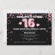 A vibrant and three dimensional look number sixteen in pale pink appears to sparkle and shine. It has two small pink hearts on either side of it and is framed by vertically hanging streamers and small scattered pink and faux silver glitter. The back has faux silver horizontal stripes set against a black background with the same small scattered glitter. The overall look is elegant and stylish. This is ideal for all ladies and women celebrating their 16th birthday. It is suited to virtual / drive-by or normal celebrations.