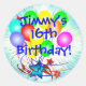 A bright, fun colourful balloon bouquet and bursting stars on another background layer of blue and white gradient burst graphic ready for you to personalise with any name and any birthday age. Insert your information with any "Name's 16th, (or easily change the age) Birthday!" Great special occasion fun and colourful custom stickers, party favours, or envelope seals! Shown is the popular round sticker. Great for the big sweet 16th birthday or for babies, kids, teens, and men and women of any age!