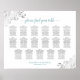 This seating chart contains table assignments for 170 guests at 17 tables, 10 guests per table. The design is simple yet elegant with dark gray and teal or turquoise text on a white background and silver faux foil lacy frills in the corners. Beautiful way to help your guests find the right table at your wedding reception. The title reads "please find your table" in elegant script calligraphy.