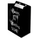 This formal and opulent birthday themed gift bag design features the message “Happy 17th Birthday,” in lavish script style text, on a black coloured background. It also features a personalised recipient name. An elaborate gift bag like this might be a respectable way of wrapping a birthday present or gift being given to somebody who is celebrating their 17th birthday. [~Z0000557]