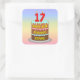 This joyful and colourful birthday-themed square sticker design features a cartoon-style depiction of a three-tier birthday cake having number-shaped candles on top showing the age “17“, along with the message “HAPPY 17TH BIRTHDAY,”, and a personalised recipient name. The background has a multicolored pastel rainbow spectrum inspired gradient pattern. Fun birthday themed stickers like these might be used or distributed at a birthday party in celebration of somebody’s 17th birthday, or perhaps used when preparing invitations or wrapping presents for such an event. [~Z0000624]