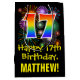 This exciting, fun, and colourful birthday gift bag design features a large number "17" with a rainbow spectrum gradient inspired pattern, along with the message "Happy 17th Birthday,", and a customisable recipient name. It also features a colourful background pattern inspired by the look of bursting celebratory fireworks. A giftbag like this might be used when giving a gift or present in honour of somebody’s seventeenth birthday. [~Z0000509]