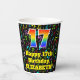 This exciting and cheerful music themed birthday paper cup design features a large number “17” with a rainbow spectrum gradient inspired pattern, along with the message “Happy 17th Birthday,”, and a personalised name. The background features a colourful pattern having music notes and symbols of various sizes and colours. Vibrant, colourful paper cups like this might be fun to have at a birthday celebration/party being held to honour somebody’s seventeenth birthday. [~Z0000541]