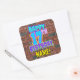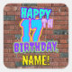 This fun birthday-themed square sticker design features the message “HAPPY 17TH BIRTHDAY,” having a vibrant, colourful, urban street art and graffiti inspired appearance, plus a personalised recipient name. The background features a brick wall inspired pattern. Fun, personalised stickers like this might be given as a birthday present, or used while wrapping presents, or perhaps used as birthday party decorations when celebrating somebody’s seventeenth birthday. [~Z0000535]