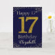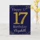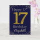 Happy Birthday with simulated golden glitter number 17 set on a solid colour and framed by faux diamonds and rhinestones. Happy birthday and recipients name in off-white font. Personalise with name or message.