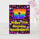 The front of this joyful and cheerful birthday-themed greeting card design features a large number “17” having a rainbow spectrum gradient inspired pattern. It also features the message “Happy 17th Birthday,”, and a customizable name. The background of the front features a pattern of heart shapes with colors like red, pink, and purple. The inside has a personalized birthday greeting message, or could perhaps be cleared and left blank if a message is to be written by hand instead. A joyful, editable birthday greeting card like this might be sent in celebration of somebody’s seventeenth birthday. [~Z0000551]
