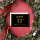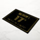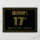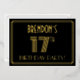 The front of this vintage-look seventeenth birthday party/celebration foil invitation features a personalised name, a large art deco style inspired number “17TH”, the message “BIRTHDAY PARTY!”, and a border pattern consisting of lines. The background of the front is coloured black by default, but it can be customised to a different colour if desired. The back features personalised details about the event, such as the date, time, location, and any other relevant information. Elegant, luxurious, customisable invitations like these might be used to invite guests to a birthday celebration/party being held to honour somebody’s 17th birthday. [~Z0000590]