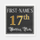 This fancy and elegant birthday themed paper napkin design features a personalized name and the message “17th Birthday Party”. The large number “17th” has a faux/imitation gold-inspired coloring pattern, the words “Birthday Party” are in ornate script-style text, and the background is colored black by default (although it can be customized). Opulent, ornate paper napkins like this might be useful at a birthday party/celebration being held to honor somebody’s seventeenth birthday. [~Z0000565]