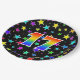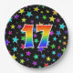 This fun, cheerful, and colourful paper plate design features a large number "17" coloured with a rainbow spectrum gradient inspired pattern. The background features a colourful star shapes pattern. Fun paper plates like this might be used at somebody’s seventeenth birthday party, or a couple’s 17th anniversary celebration, or some other seventeenth event. [~Z0000493]