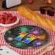 This cheerful, colorful, and fun paper plate design features a large number "17" containing a rainbow spectrum gradient inspired pattern. It also features a exciting and vibrant bursting celebratory fireworks inspired pattern. It has a black colored background. Fun paper plates like this might be used at a celebration being held to honor somebody’s 17th birthday, a 17th anniversary, or some other seventeenth event. [~Z0000490]