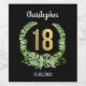 Modern design for a 18th birthday party with a gold 18 and a scripted name, embellished by a green wreath on a black background. Customise name and date.