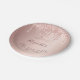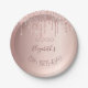 A paper plate for a girly and glamourous 18th birthday party. A faux rose gold metallic looking background with an elegant faux rose gold glitter drips, paint drip look. The text: The name is written in dark rose gold with a large modern hand lettered style script. Template for name, age 18 and a date.