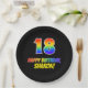 This fun, colorful, and cheerful birthday paper plate design features a large number "18" and the message "HAPPY BIRTHDAY,", both having a rainbow spectrum gradient inspired pattern coloring, along with a bold yellow custom name. It has a black colored background. Birthday themed paper plates like this might be fun to use at a party being held to celebrate somebody’s 18th birthday. [~Z0000488]