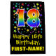 This exciting, vibrant, and fun birthday gift bag design features a large number "18" with a rainbow spectrum gradient inspired pattern, along with the message "Happy 18th Birthday,", and a customisable recipient name. It also has a background pattern featuring star shapes of various sizes and colours. A fun gift bag like this might be used when wrapping presents being given to somebody in celebration of their eighteenth birthday. [~Z0000510]