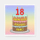 This upbeat and colourful birthday paper napkin design features a cartoon-style depiction of a three-tier birthday cake having numeral-shaped candles on top showing the number “18“, along with the message “HAPPY 18TH BIRTHDAY,”, and an editable recipient name. The background features a multi-colour pastel rainbow spectrum inspired gradient pattern. Cheerful paper napkins like these might be used when hosting a party for somebody in celebration of their 18th birthday. [~Z0000623]