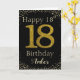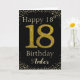 Happy Birthday with simulated golden glitter number 18 set on solid black and framed by faux diamonds and rhinestones. Happy birthday and recipients name in off-white font. Personalize with name or message.