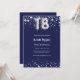 A modern, stylish and glamourous invitation for a 18th birthday party. A navy blue background, decorated with faux silver stars. Personalise and add your name and party details. Number 18 is written with a balloon style font.