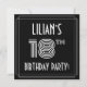 The front of this 1920s/1930s style inspired eighteenth birthday celebration invitation card design features a custom name, a fancy art deco style inspired number “18th”, the message “BIRTHDAY PARTY!”, and a multi-line border. There is a black-coloured background on the front by default, but it can be customised to a different colour if desired. The back features personalised details about the event, such as the date, time, location/venue, and any other information that may be useful. Stylish, elegant, editable invitations like these might be used to invite guests/attendees to a birthday party/gathering being held to honour somebody’s 18th birthday. [~Z0000615]