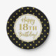 Happy 18th birthday party plates in black white and gold polka dots pattern.