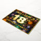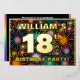 The front of this bold eighteenth birthday party/celebration foil invitation card design features a personalised name, a large number “18th”, the message “BIRTHDAY PARTY!”, and a border. The background of the front has a fun, multicolored pattern that resembles bursting celebratory fireworks. The back features personalised details about the event, such as the date, time, venue, and any other useful information. Personalised invitations like these might be a fun way to invite guests to a birthday gathering/party being held in celebration of somebody’s 18th birthday. [~Z0000602]