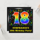 The front of this fun, vibrant, and colourful birthday party invitation design features a large number "18" having a rainbow spectrum gradient inspired pattern. It also features a customisable name and the message "18th Birthday Party!". Part of the background features a fun pattern of various music notes and symbols having a variety of colours and sizes. The back features customised details pertaining to the event that the potential guests are being invited to. Joyful, editable birthday celebration invitation cards like this might be sent to potential guests of a celebration being held to celebrate a song composer’s, a singer’s, a musician’s, or somebody else’s 18th birthday. [~Z0000427]