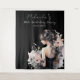 The design features a watercolor texture depicting a lady in a black gown, holding a bouquet of flowers in peach and rose gold accents. This adds a touch of natural beauty and grace, setting the tone for a memorable celebration. She also wears matching flowers in her hair. The delicate design elements harmonise beautifully, creating an atmosphere of elegance and enchantment.