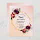 On front: An invitation for a 18th birthday party. A rose gold coloured ombre background with a faux gold geometric frame. Decorated with dark purple and burgundy flowers, roses and boho style feathers. Templates for a name and party details. The name is written with a hand lettered style script, grey coloured letters.