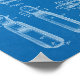 Blue technical design paper background with white line drawing.