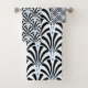 Art deco 1920s inspired black and white palmetto fans with blue accents patterned bath towels.