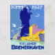Vintage 1927 poster celebrating the centennial of Bremerhaven, Germany which was founded in 1827. The design depicts a harbour view of the city and the Roter Sand lighthouse in the background.