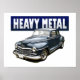 Digitally enhanced image of black 1946 Plymouth coupe sitting beneath banner stating HEAVY METAL.