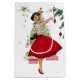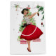 Vintage 1950 Christmas woman in red skirt with a Christmas tree in the background.