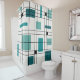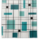 A midcentury modern abstract pattern with black lines and colourful square and rectangle shapes in shades of teal and turquoise.