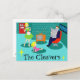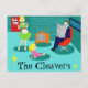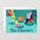 This customisable 1950's Classic Television Postcard features a perfect 1950's family in its natural habitat. They are in their turquoise and teal living room. The father is lounging in his red egg chair, while reading the newspaper. The daughter is sprawled out on the floor in a lovely, pink frock. Her blonde hair is in a ponytail and she is kicked back watching a black and white television show on the bright orange, tube TV set. To the left, the mother is wafting into the room in a flouncy green dress and a white apron with red detailing. Not a hair on her blonde head is out of place. She is carrying a pink, three-layer cake with chocolate frosting. You won't believe the details in this design. The bright, red door in the distance, the retro artwork on the wall, the real newsprint on Dad's newspaper and the black and white housewife vacuuming her 1950's living room on the television set make this absolutely irresistible! Simply click on the "Customise It" icon to replace the existing text with your own. Oh, my stars! They are a 1950's classic television family watching a 1950's classic television show. Is there no end to this brilliance?