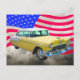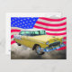 Classic yellow 1955 Chevrolet Bel Air antique automobile photo and American Flag background.