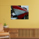A low and close shot of the side of a classic red and white Chevy Bel Air from the rear, capturing that amazing fin!