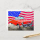 Red 1957 Chevrolet Bel Air 2-door convertible classic car photo with US Flag background.