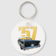 Rear view of a black and white Chevrolet Bel Aire sitting before large gold '57