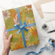 This gift wrap has a a retro floral pattern in shades of green, pink, orange and yellow inspired by designs of the 1960s and 1970s.