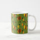 This mug has a mid-century modern 1970s design of diamonds, and starbursts on a field of green.