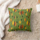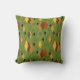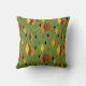 This throw pillow has a mid-century modern 1970s design of diamonds, and starbursts on a field of green.