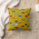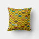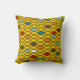 This throw pillow has a 1970s design of ovals in red, orange, brown, white, and blue on a field of gold.