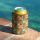 This can cooler has a mid-century modern design of rounded rectangles leaning to the side with leaning rectangles inside made from lines all in 1970s colours.