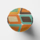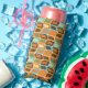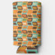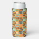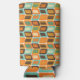 This seltzer can cooler has a mid-century modern design of rounded rectangles leaning to the side with leaning rectangles inside made from lines all in 1970s colours.