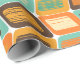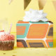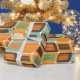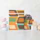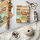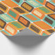 This wrapping paper has a mid-century modern design of rounded rectangles leaning to the side with leaning rectangles inside made from lines all in 1970s colours.