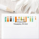 These return address labels have a mid-century modern design of vertical lines in 1970s orange, brown, green, and blue on a field of white with horizontal white lines crossing them.